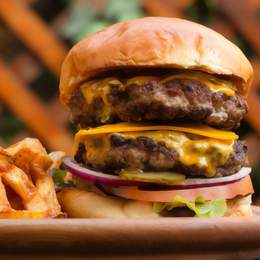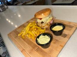 Carne de ternera, lechuga, tomate, bacon, jamón, 3 quesos, mozzarella gratinado, salsa a escoger y acompañado de patatas fritas