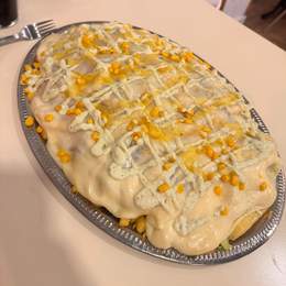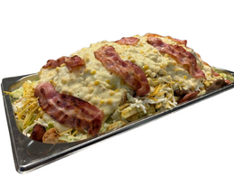 Patatas (1000 g.), lechuga picada, 3 salchichas Frankfurt grandes picadas, 3 chorizos grandes picados, carne de ternera (300 g.), pollo (300 g.), queso costeño rayado, patata paja, queso mozzarella (350 g.), salsa tártara, salsa de piña, bacon y maíz