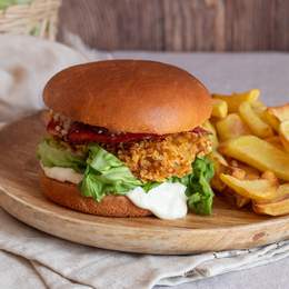 150 gr de pollo crispy, queso cheddar,tomate,lechuga,cebolla a la plancha,, salsa de la casa