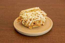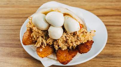 Arepa rellena de carne mechada,caraotas negras,tajada de maduro,una capa de queso blanco