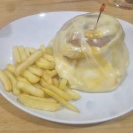 Carne de ternera, pollo, chuleta, bacon, huevo, jamón, queso gratinado, salsa de la casa, salsa a escoger y acompañado de patatas fritas