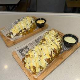 300 gramos de patatas y 150gramos de salchicha con salsa a elegir