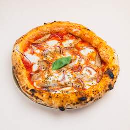 Tomate, cebolla roja, guanciale de norcia, mozzarella y queso pecorino D.O.P