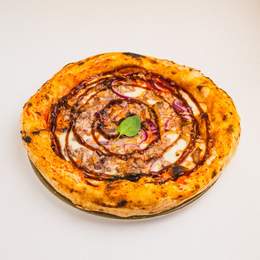 Tomate, mozzarella, salchicha de elaboración propia, guanciale, cebolla roja y salsa bbq