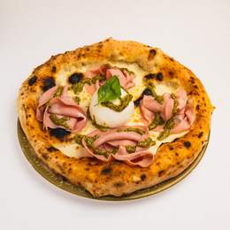 Mozzarella, mortadela con pistacho, burrata D.O.P (125 g.) y pesto de pistacho