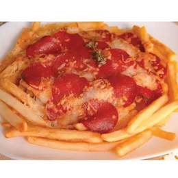 Carne picada de pollo o ternera, patatas, queso y salsas especiales.