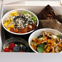 Mini poke de salmon, aguacate, arroz integral, edamame