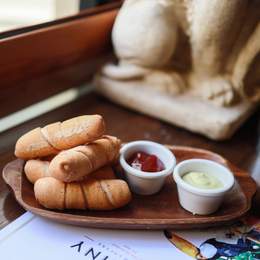 Palitos crujientes de harina de trigo rellenos de queso latino y acompañados de mermelada de tomate y guasacaca