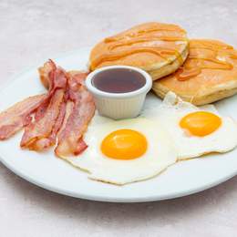 Dos pancakes con mantequilla, sirope de arce, dos huevos fritos y bacon crujiente.