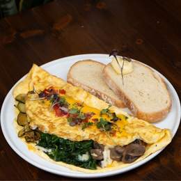Hecha con tres huevos de granja ,calabacín, champiñones y espinacas salteadas con queso