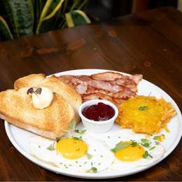 Dos huevos al gusto, tiras de bacon, Patata Hash Brown, pan tostado con mantequilla y mermelada.