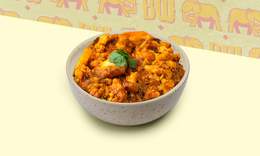 Nuestro bol más suave: deliciosos trozos de pollo dorados, guisados en una salsa cremosa made in Delhi, con una base de arroz.