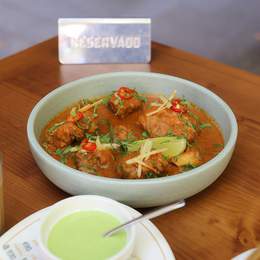 PECHUGA DE POLLO MARINADA 24h EN YOGUR ESPECIADO Y ASADA AL HORNO TANDOOR CON CURRY KORMA SUAVE, ESPECIADO Y DULZÓN A BASE DE ANACARDOS, COCO Y LECHE DE COCO.