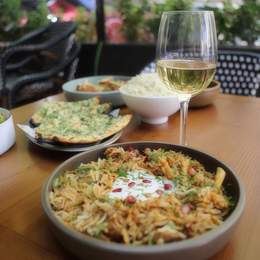 POLLO MARINADO Y COCINADO A FUEGO LENTO CON CARDAMOMO, CLAVO Y ANÍS ESTRELLADO SERVIDO CON ARROZ BASMATI, CEBOLLA Y YOGURT.