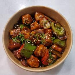 QUESO PANEER CASERO CON CON MIX DE ESPECIAS ELABORADAS POR NUESTRO CHEF SERVIDO CON PIMIENTOS, CEBOLLA, TOMATE Y SALSA DE SOJA.