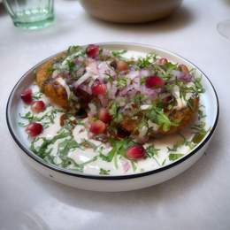 RELLENO DE PATATA, GARBANZOS Y GUISANTES SERVIDO CON SALSA TAMARINDO, MENTA Y YOGURT (2u)