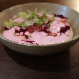 IOGURT ESPECIADO CON PEPINO, REMOLACHA, CILANTRO FRESCO Y GRANADA.