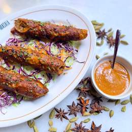 MUSLOS DE POLLO MARINADO EN IOGURT Y ESPECIAS. ASADO AL MOMENTO EN HORNO TANDOOR.