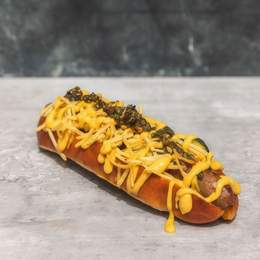 Nuestra salchicha 100% DUROC en tierno pan brioche, cubierta con patatas paja, pickles caseros, mostaza y unos toques de chimichurri de hierbas frescas.