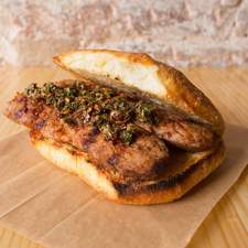 Nuestro chorizo criollo 100% Duroc, pan ciabatta de la casa, chimichurri de hierbas frescas y salsita criolla (250 G.)