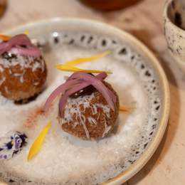 Cuatro croquetas de pulled pork acompañadas de mayonesa de ajo negro, parmesano y cebolla encurtida
