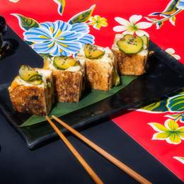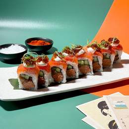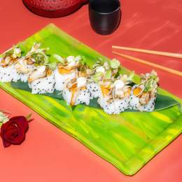 Un Uramaki versión tropical, relleno de mango, aguacate y tofu crujiente, acabado con queso crema fermentado casero y tartar de mango picante.