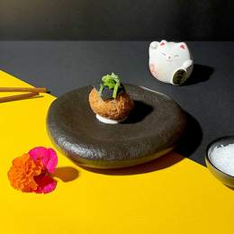 Croqueta de arroz con berenjena “Yu-Xiang”, cubierta por una velo de berenjena.