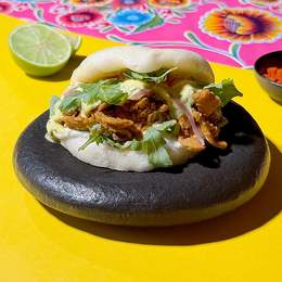 Pan bao relleno de tikka masala de “pollo”, salsa raita, cebolla encurtida y cilantro.