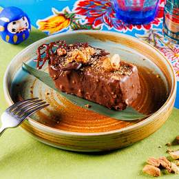 Barra de chocolate rellena de turrón, caramelo y cacahuetes triturados salados