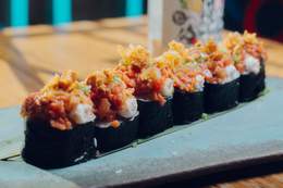 Nuestro carnoso rollo de sushi uramaki, arroz de sushi tradicional, algas, carne de monte en movimiento, cebolla caramelizada, pepino, caviar de tapioca, tomate asado, mayonesa de ajo.