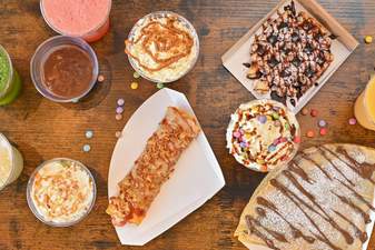 Dos creps o gofres a elegir, bañados con todos nuestros siropes irresistibles