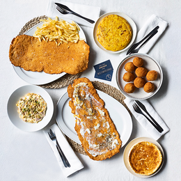 40 cm de escalope finísimo de pechuga de pollo de campo empanado. (Mételo 45 segundos en el horno previamente calentado a 220ºC.)