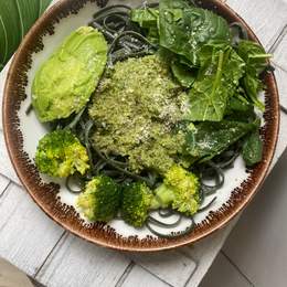 Tagliatelle integral con espirulina orgánicos con salsa pesto, aguacate, espinacas frescas, brócoli y parmesano