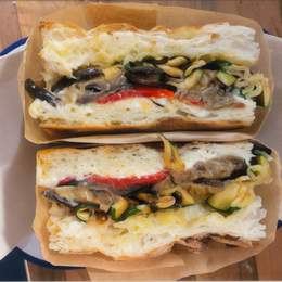 La mejor Focaccia de la ciudad rellena de: Berenjenas asadas, calabacín asado, queso burrata, queso curado de vaca y pimiento del piquillo