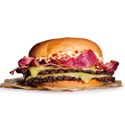 Doble carne de vacuno tipo smash, bacon & cheese fries y queso Cheddar en pan estilo brioche.
