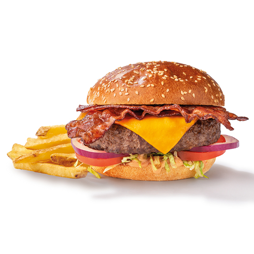 Carne de vacuno, queso cheddar y bacon ahumado, sobre base de lechuga, tomate, cebolla morada y salsa especial FH en pan clásico.