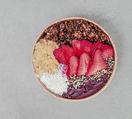 Açaí, keto cacao granola, homemade cashew butter, strawberry, chested coconut, mixed seeds.