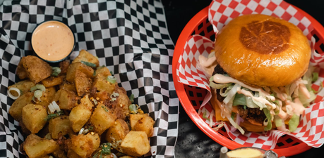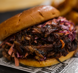 Costilla de res desmenuzada con queso cheddar y ensalada de col en un pan brioche con mantequilla tostado