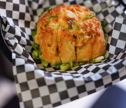 Pan recién horneado relleno con mezcla de quesos Nikki y ajo cubierto con cebollas verdes