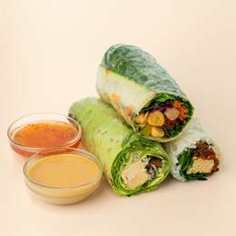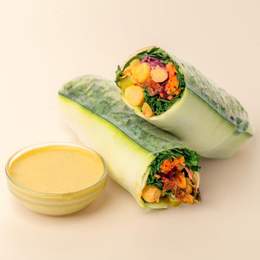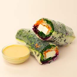 Rice paper, basmati rice, yellow corn, baby spinach, dried tomatoes, spicy yoghurt salsa. Rich in protein & fiber