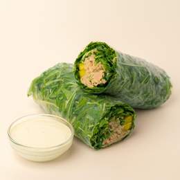 Rice paper, quinoa, rucula, line caught tuna, celery, capers, guacamole, pickled cucumber. Rich in omega 3, vitamins & minerals. Low carb. No gluten.Oferta de una salsa a elegir