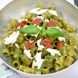 Pasta con pesto de albahaca, stracciatella de burrata y tomates secos