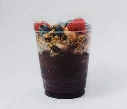 Con pulpa de Açai sin azúcar, granola sin gluten, banana, arándanos, frutas de estación y miel