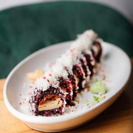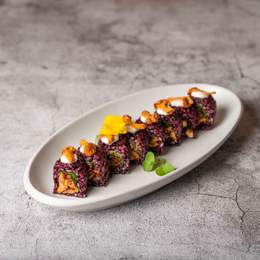 Uramaki con heüra, tomate seco, cebolla caramelizada , salsa chile y miso, arroz negro, crujiente de panko sin gluten, kimchi sésamo