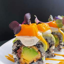 aguacate, mango, tomate seco, tempura de aguacate, salsa mango, queso de anacardo, salsa sriracha (8 uni)