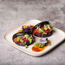 papel de arroz, col morada, zanahoria y daikon encurtidos, mango, menta, pepino, canónigos, salsa cacahuete & ponzu