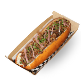 Frankfurt, carne mechada, cebolla roja, cebollino y mayonesa