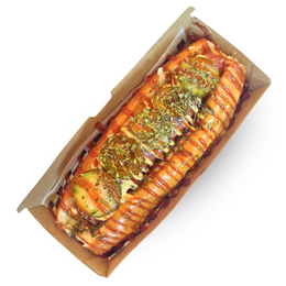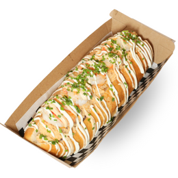 Frankfurt, gambas desmenuzadas, cebolla frita, cebollino, mayonesa y queso