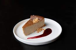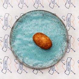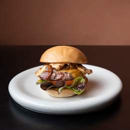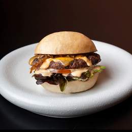 Ternera con guanciale, tomate, loyo Rosso, cebolla caramelizada, cheddar, salsa especial The Lot y gel de yema de huevo con Pedro Ximénez