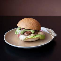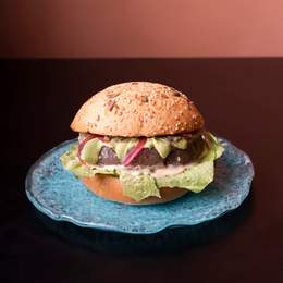 No bacon, no queso, lechuga, tomate, cebolla caramelizada y salsa especial vegana